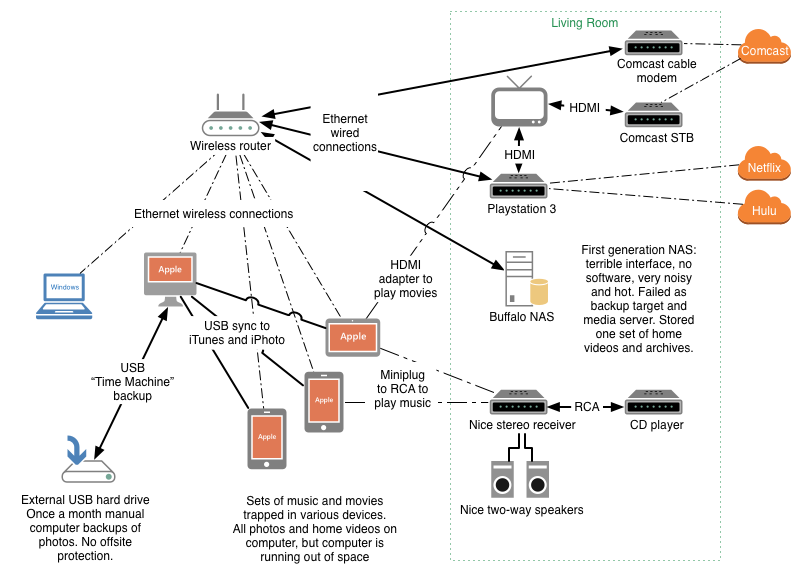 Seem crazy? I’m betting that what you have in your home isn’t all that different when you have two adults (that have worked in any typical corporate setting) and two kids (that are the subject of much of the content generated). In short, it was a mess. Data on many devices. Some data copied in many places. Some data stored in only one device. Data stored on devices that were on the verge of dying. Data that never made it to new devices. Music that never got played. Music that needed to be plugged into different speaker systems and docks to be played. Photos and videos that were only seen once (really cute ones too). Photos and videos that were never really seen at all. And worst of all, semi-consistent backup of a subset of the data and no offsite disaster protection, even for the most precious stuff.